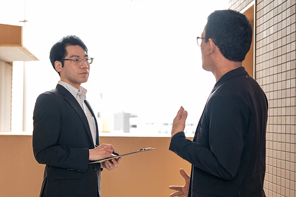 退去時には現地を訪れ、室内の汚損や設備の状態を細かくチェック。その後、協力会社の専門スタッフと連携して原状回復工事の見積もってもらい、必要な修繕や付加価値の内容を検討します。