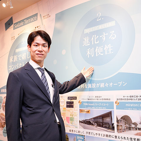東武伊勢崎線の獨協大学前(草加松原)駅にあるマンション「ソライエテラス」の販売の仕事をしています。現場はかつて東洋一の規模と言われたUR松原団地があった場所で、全796戸の沿線最大級のビッグプロジェクト。駅徒歩11分、公園を抜けたところにマンションがあります。